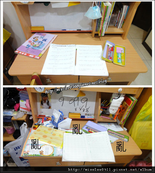 妹妹的桌上凌亂不堪,書桌這麼亂,寫個功課掉這本書、掉一隻筆的…