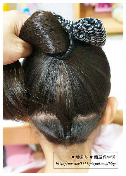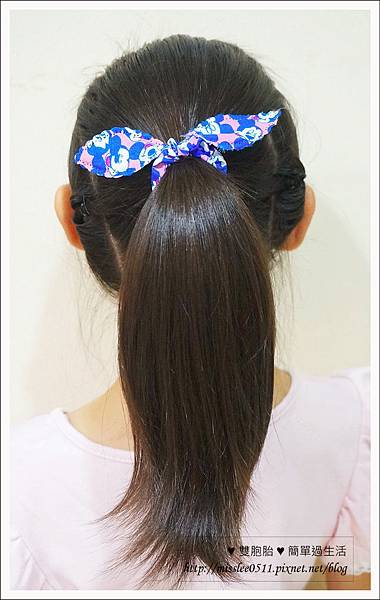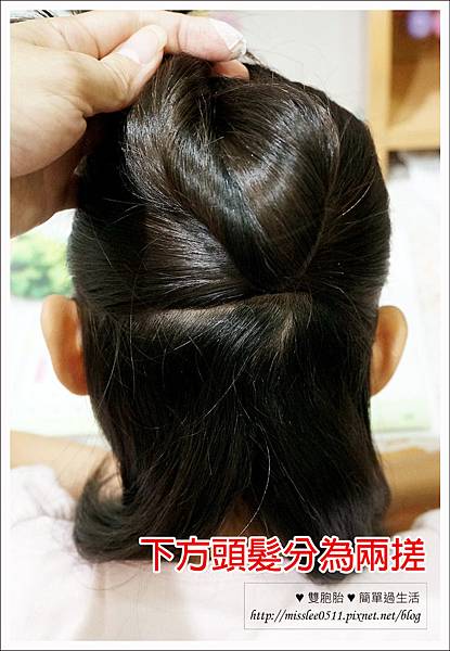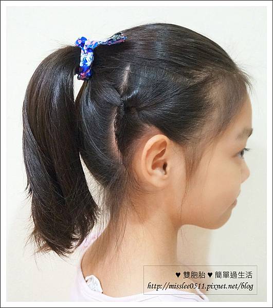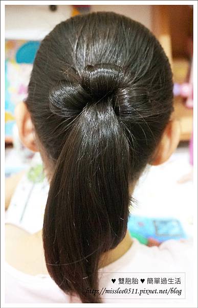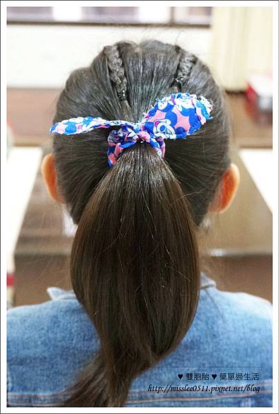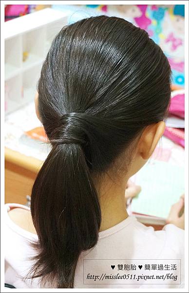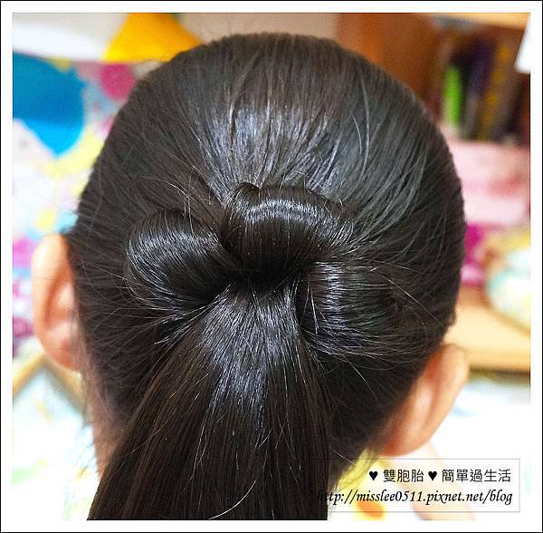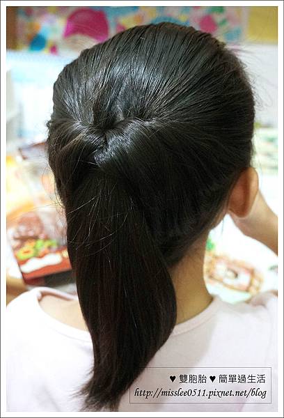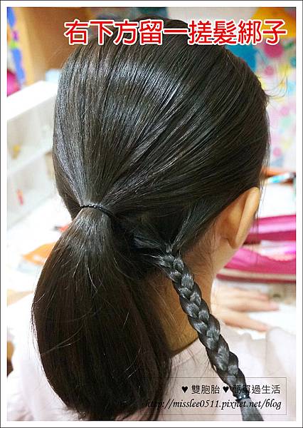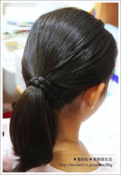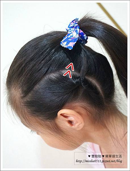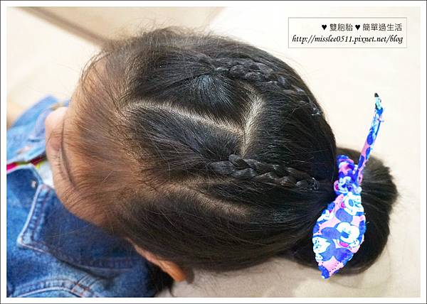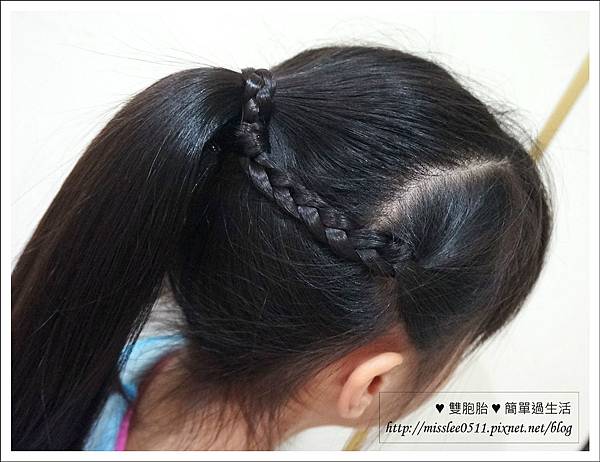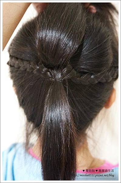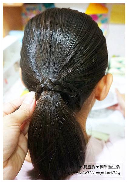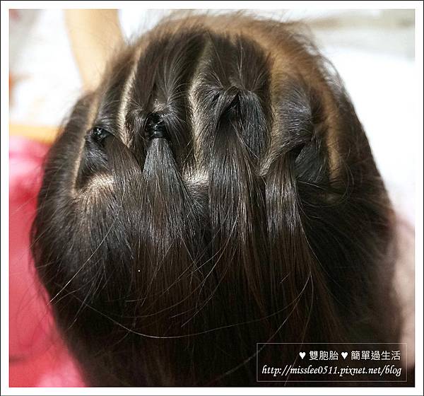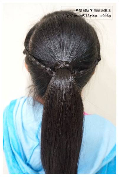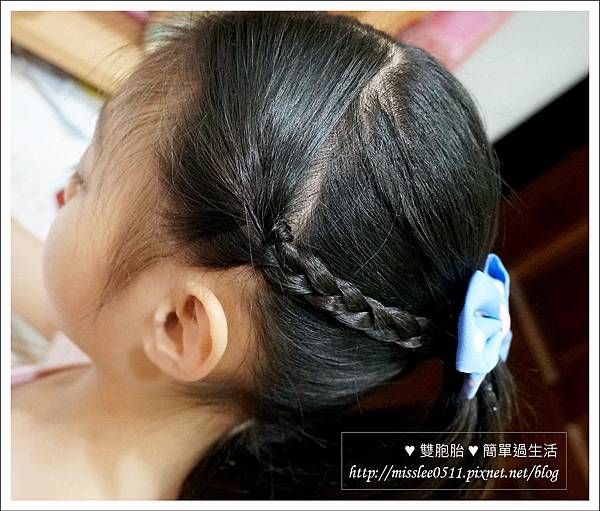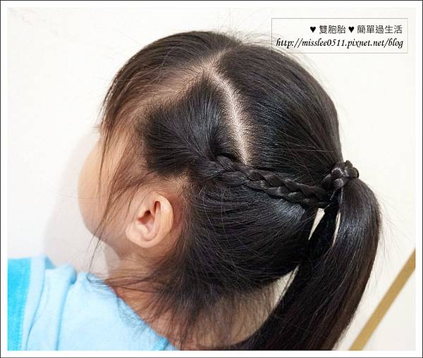 所以我在頭頂的上端,往後方抓了兩條小辮子。