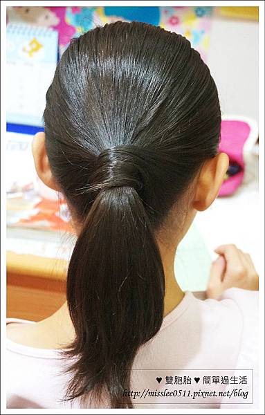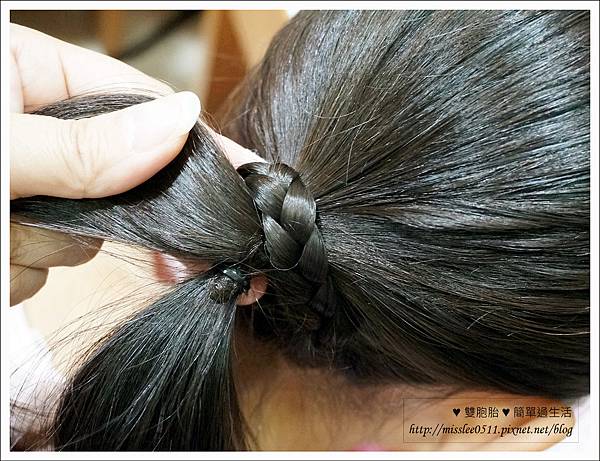 也是再抓一小搓原本馬尾的頭髮合併固定住並隱藏於馬尾內側。