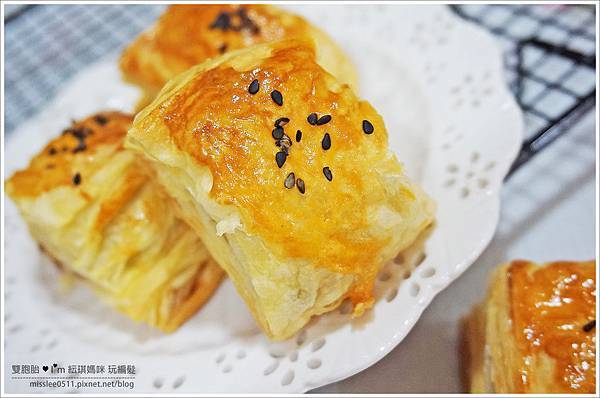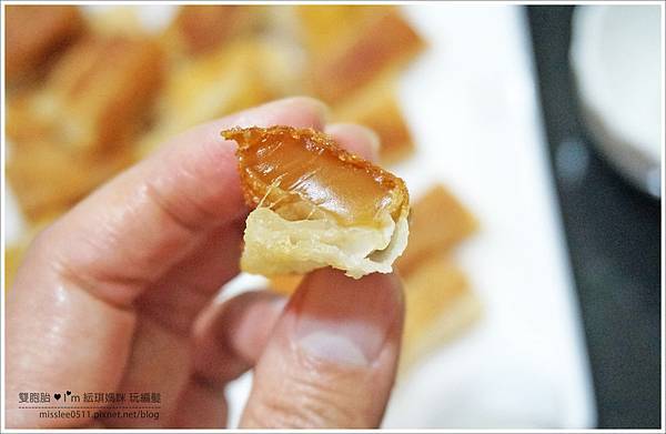 我覺得切的小塊一點,變成了一口酥,吃起來口感還不賴,屑屑兒也不會掉滿地!!